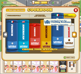 Les bénéfices de votre établissement débloquent l'accès à de nouveaux plats cuisinés. Le joueur peut même suivre des cours de cuisine et se spécialiser dans la cuisine de son choix: française, italienne, japonaise, végétarienne, c'est à vous de décider.